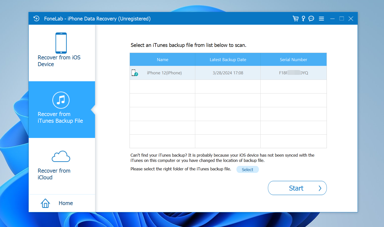Select Recovery Mode: In FoneLab for iPhone, you’ll see three recovery modes: Recover from iOS Device, Recover from iTunes Backup File, and Recover from iCloud Backup File. Choose "Recover from iOS Device" if you want to directly recover data from your iPhone.