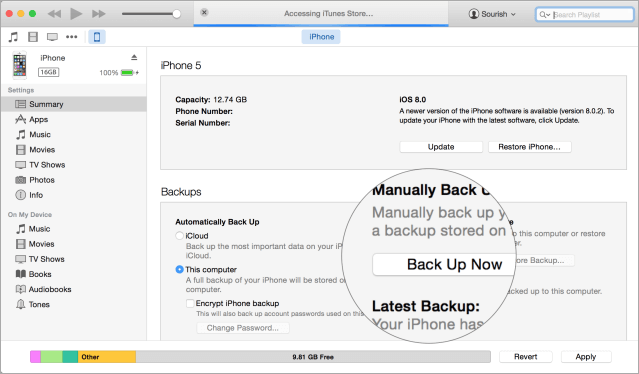 The alternative to iCloud backup is iTunes. Almost all the iOS users know about iTunes because it is Apple's handyman program to interact with iOS devices like iPhone, iPod touch, and iPad. iTunes also useful to perform a complete backup of the information on iOS device. The backup file will be stored on the local computer, which means you can backup all the data on the device no matter how big it is. And it is also much faster than iCloud because you don’t need to connect to remote server for uploading.